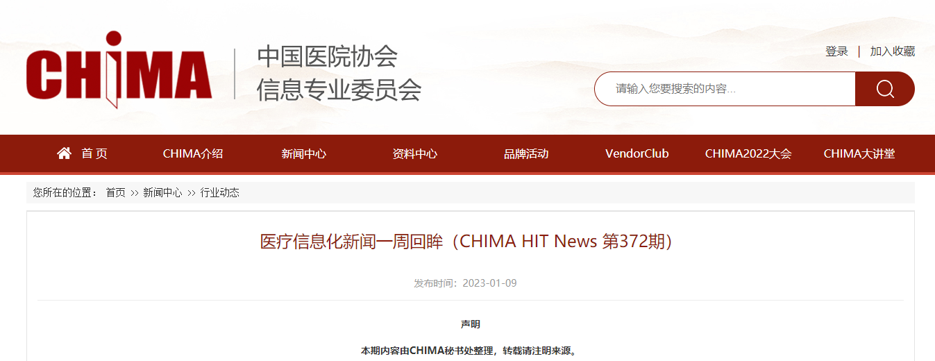 醫(yī)療信息化新聞一周回眸(CHIMA HIT News 第372期)